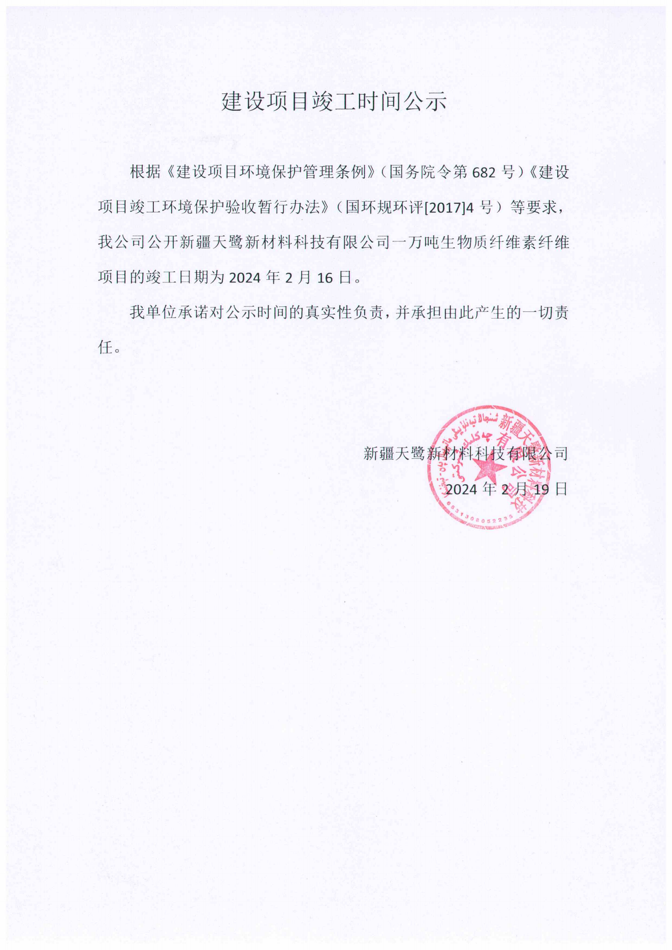 根据《建设项目环境保护管理条例》(国务院令第682号)《建设项目竣工环境保护验收暂行办法》(国环规环评[2017]4号)等要求,我公司公开新疆天鹭新材料科技有限公司一万吨生物质纤维素纤维项目的竣工日期为2024年2月16日。