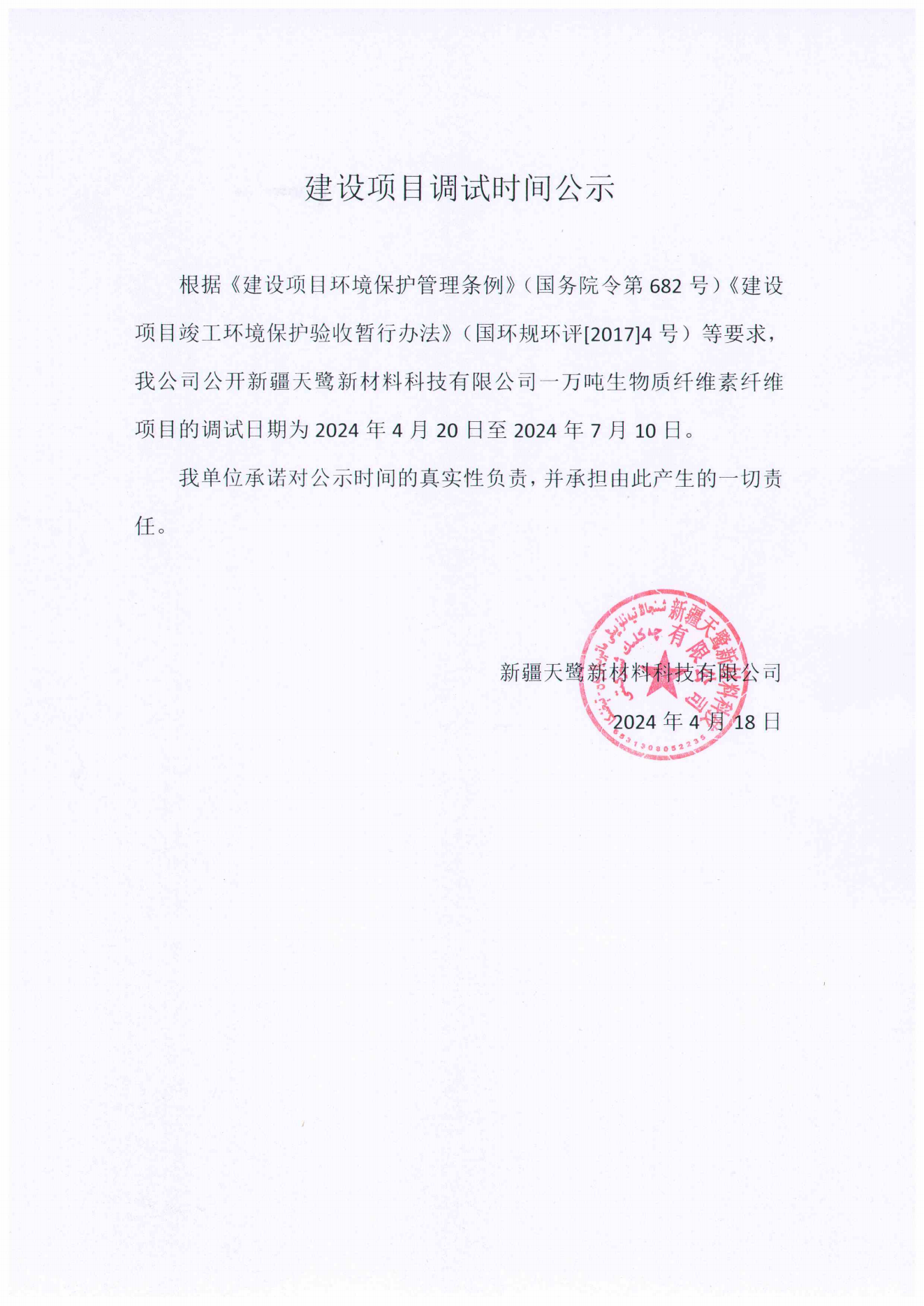 根据《建设项目环境保护管理条例》(国务院令第682号)《建设项目竣工环境保护验收暂行办法》(国环规环评[2017]4号)等要求,我公司公开新疆天鹭新材料科技有限公司一万吨生物质纤维素纤维项目的调试日期为2024年4月20日至2024年7月10日。